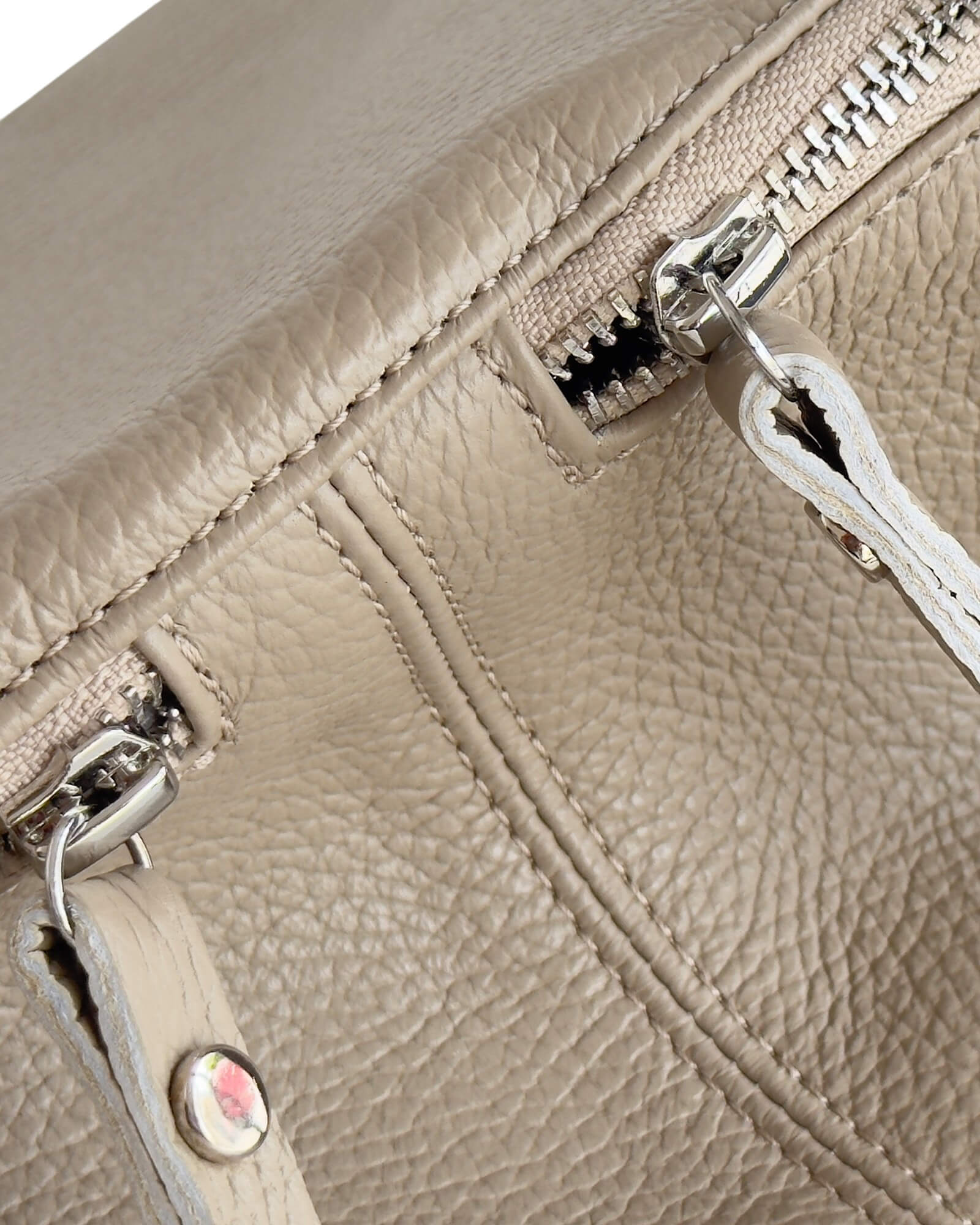 Wir verwenden hochwertige Metallreißverschlüsse, die mühelos gleiten und dem Design eine raffinierte Note verleihen. Ihre Stärke und ihr Glanz heben sowohl die Funktion als auch die Ästhetik der Tasche hervor.