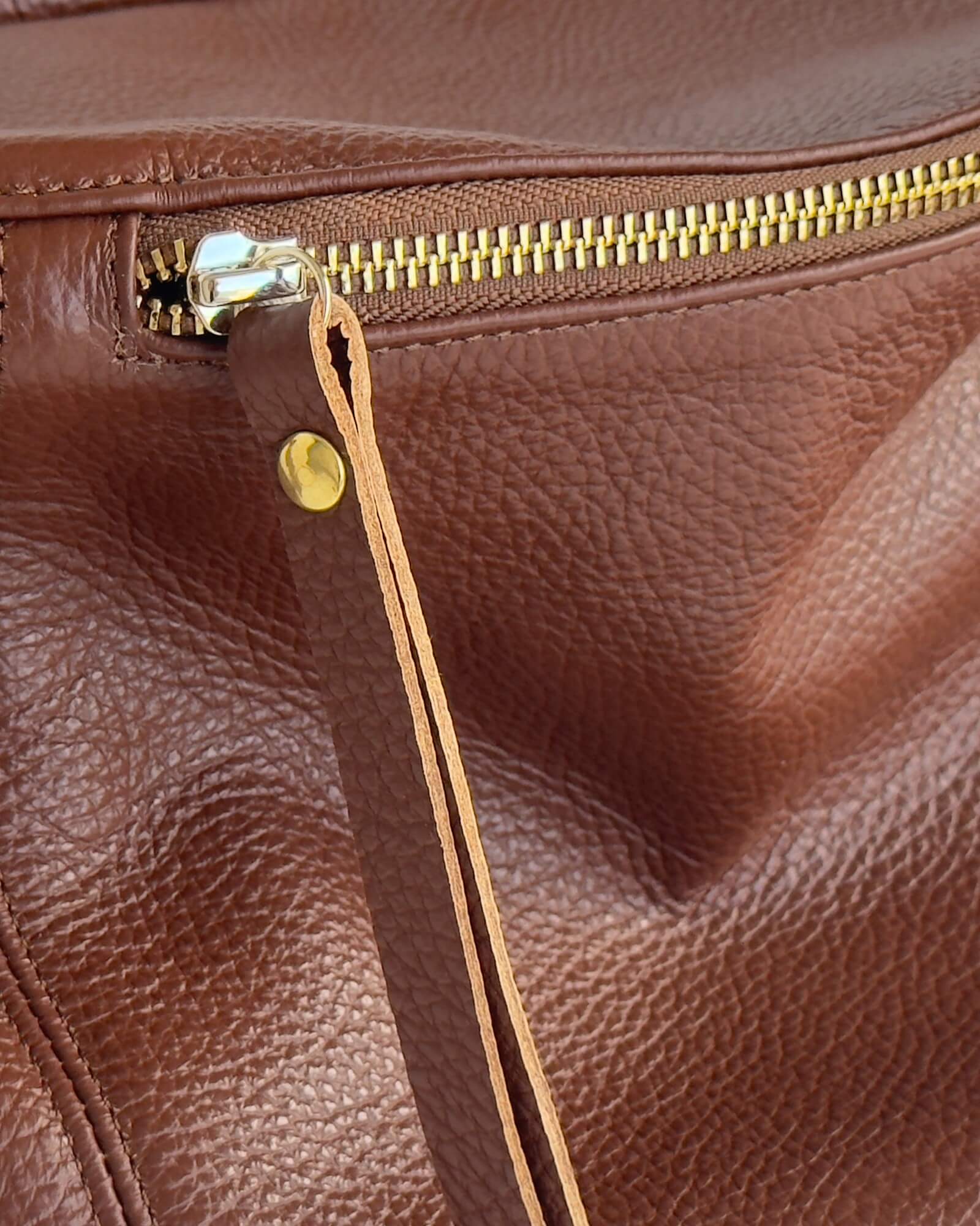 Wir verwenden hochwertige Metallreißverschlüsse, die mühelos gleiten und dem Design eine raffinierte Note verleihen. Ihre Stärke und ihr Glanz heben sowohl die Funktion als auch die Ästhetik der Tasche hervor.