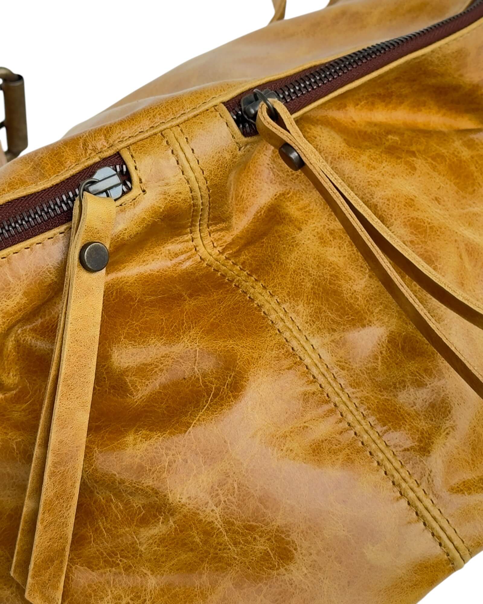 Wir verwenden hochwertige Metallreißverschlüsse, die mühelos gleiten und dem Design eine raffinierte Note verleihen. Ihre Stärke und ihr Glanz heben sowohl die Funktion als auch die Ästhetik der Tasche hervor.