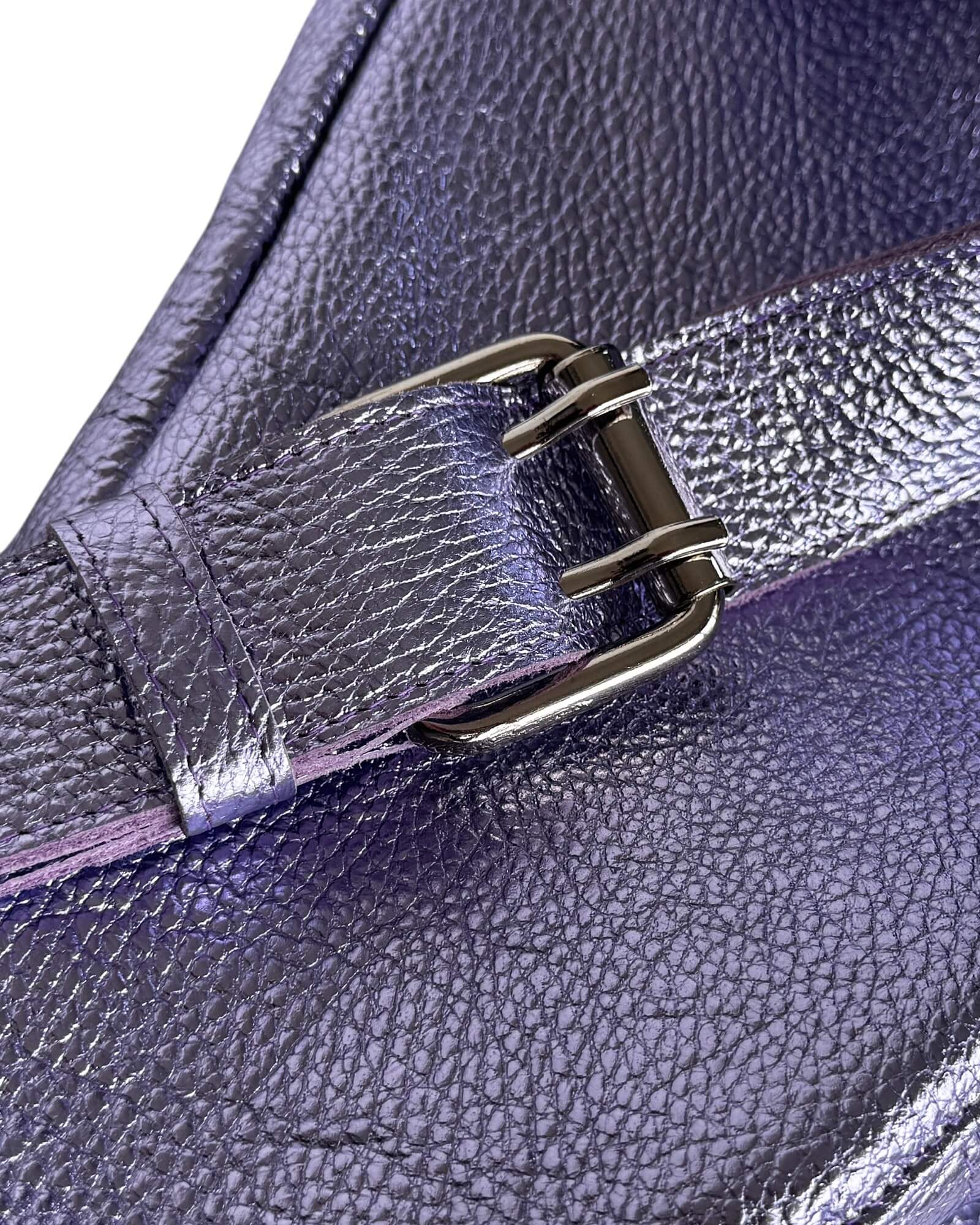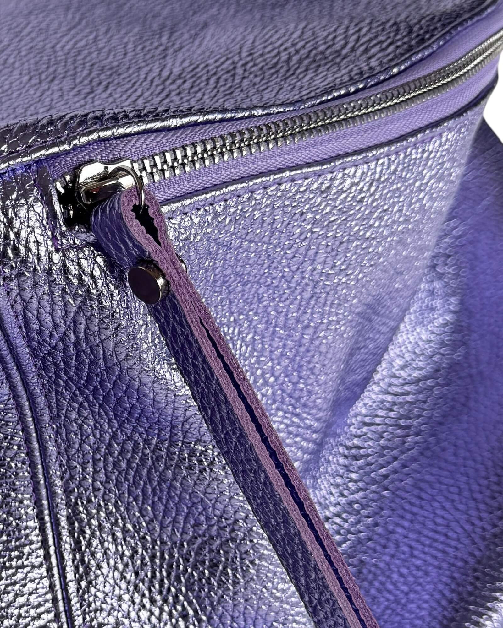 A slouchy, soft oversized leather sling bag with a metallic lilac finish. Crafted from Italian pebbled leather, this large fanny pack offers generous space and hands-free ease for travel and city strolls.
