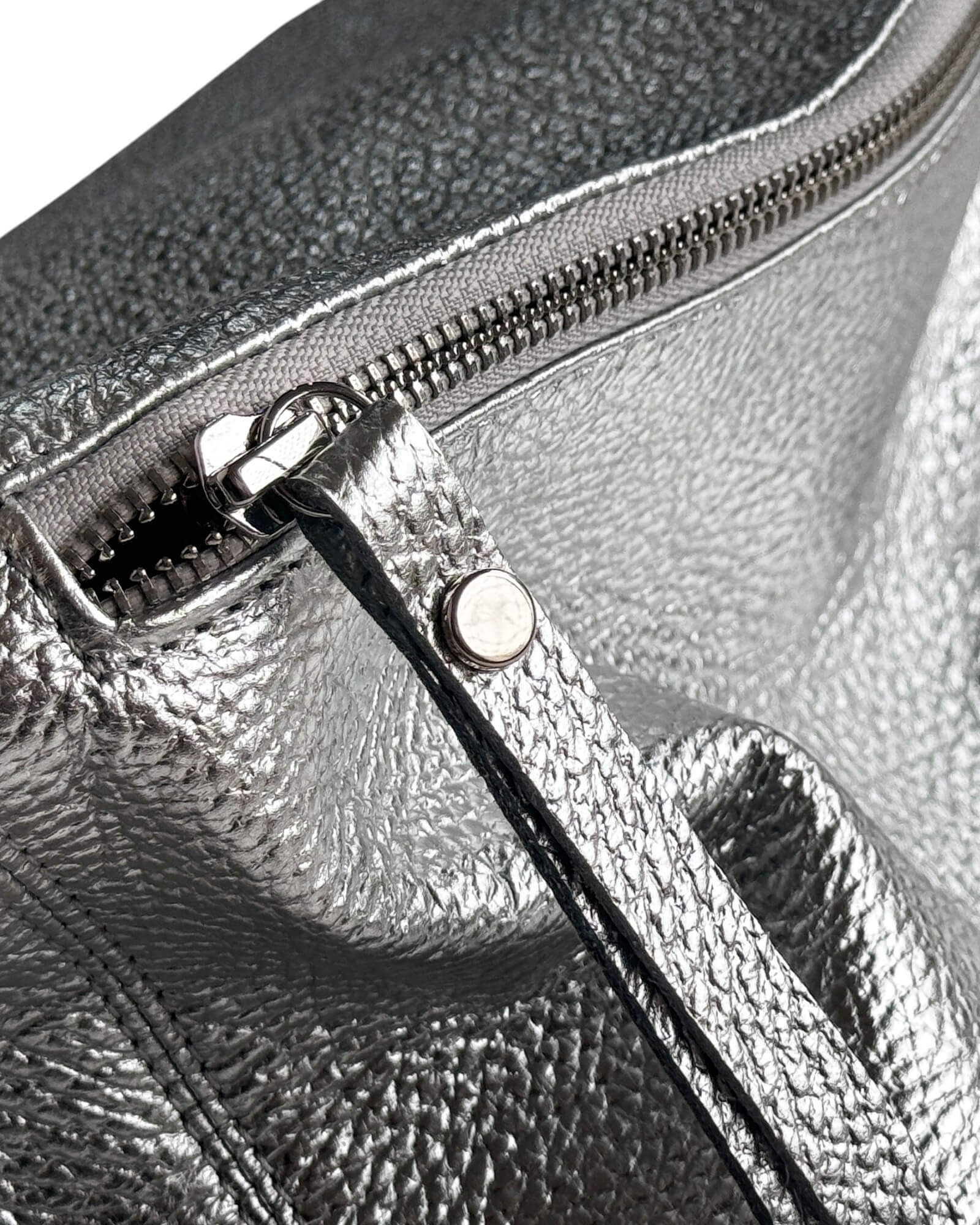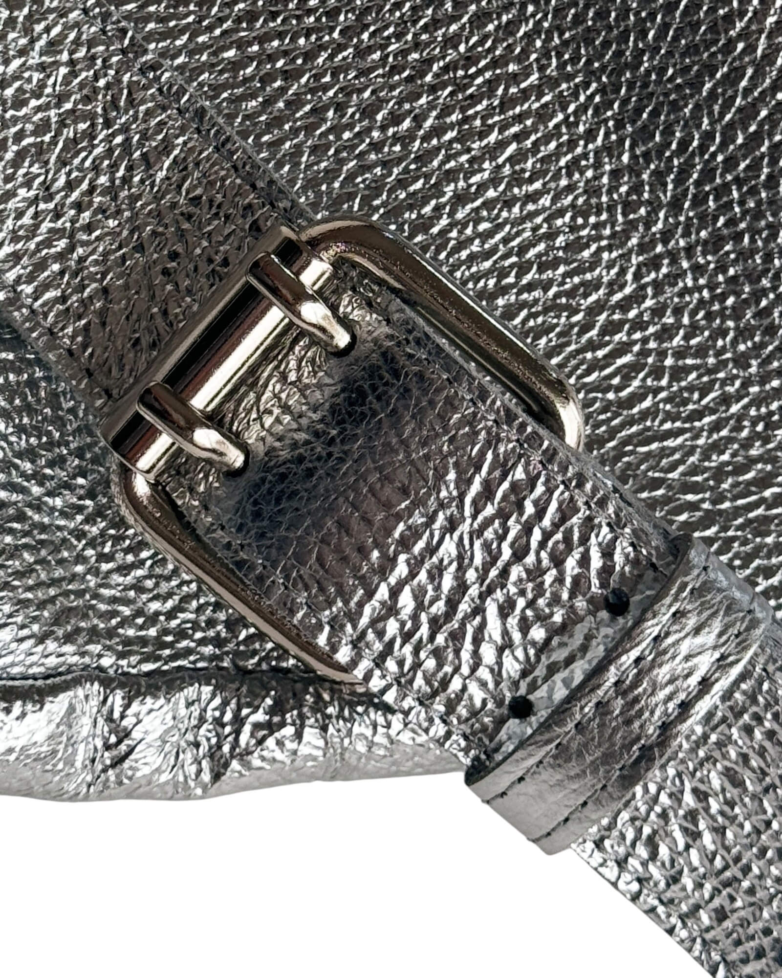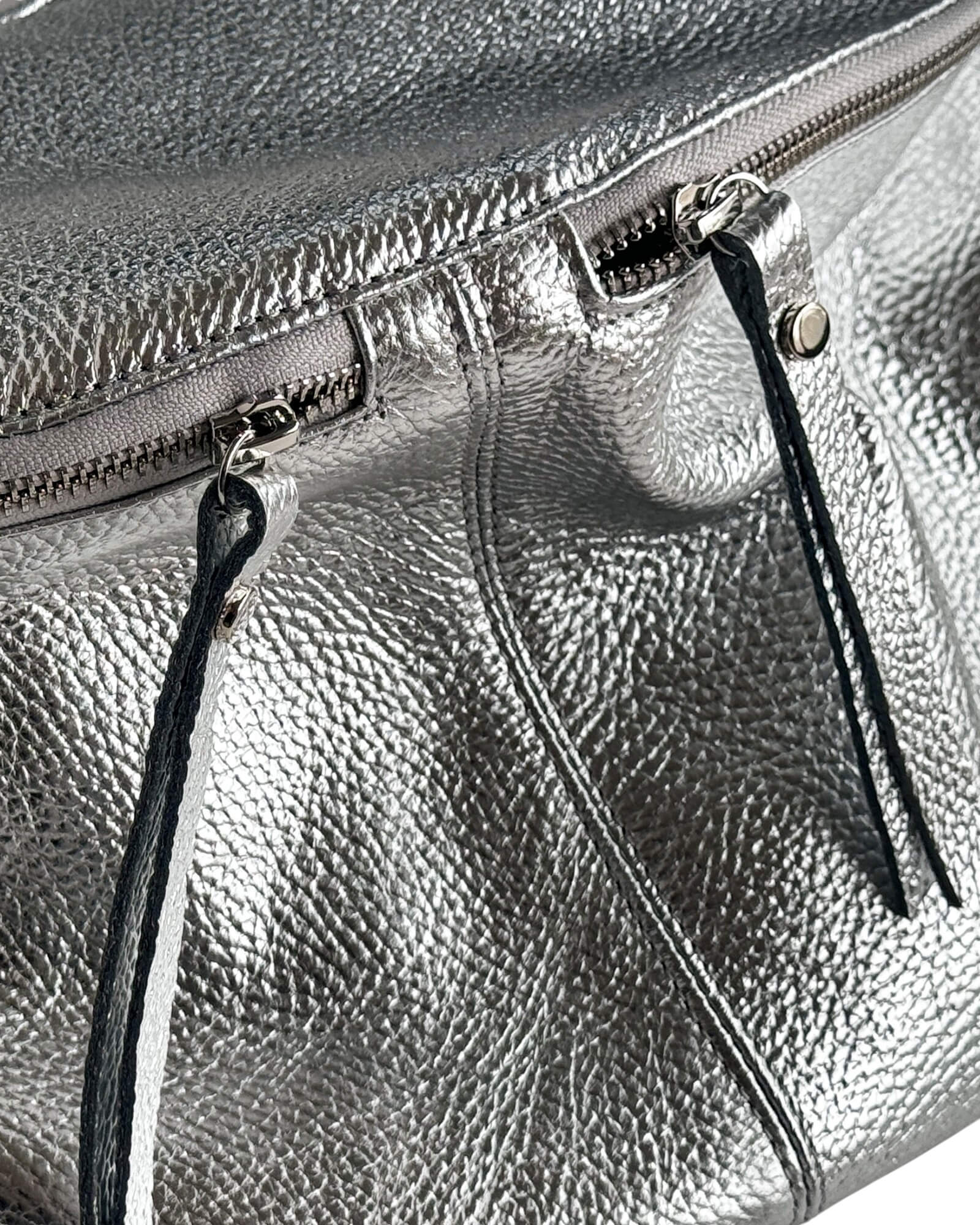 A slouchy, soft oversized leather sling bag with a metallic silver finish. Crafted from Italian pebbled leather, this large fanny pack offers generous space and hands-free ease for travel and city strolls.